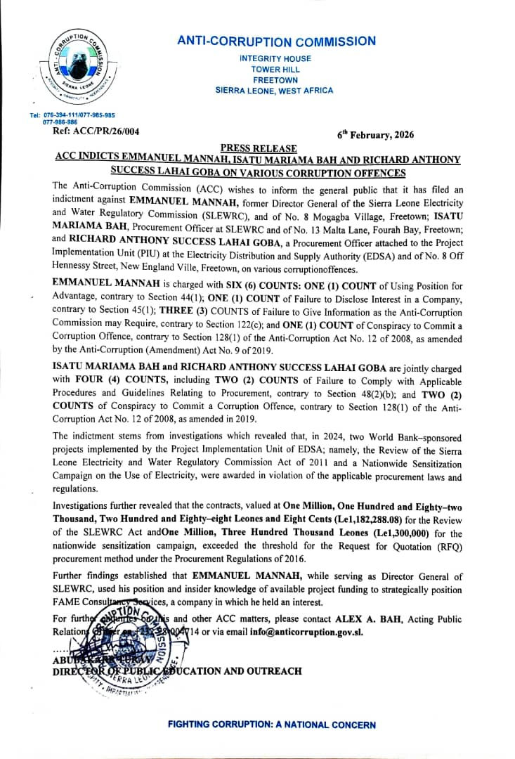 The indicted individuals are Emmanuel Mannah, former Director General of the Sierra Leone Electricity and Water Regulatory Commission (SLEWRC); Isatu Mariama Bah, Procurement Officer at SLEWRC; and Richard Anthony Success Lahai Goba, a Procurement Officer with the Project Implementation Unit (PIU) at the Electricity Distribution and Supply Authority (EDSA).